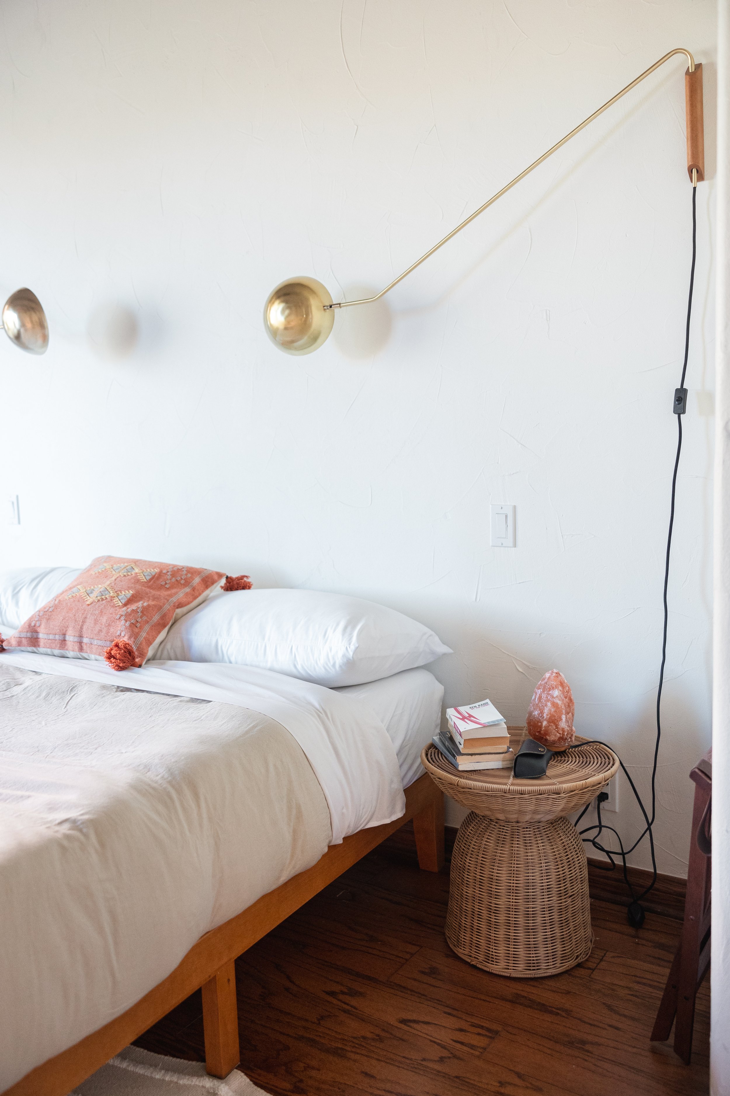 A beautiful and bright room featuring a natural mattress, linen sheets, and salt rock lamps.