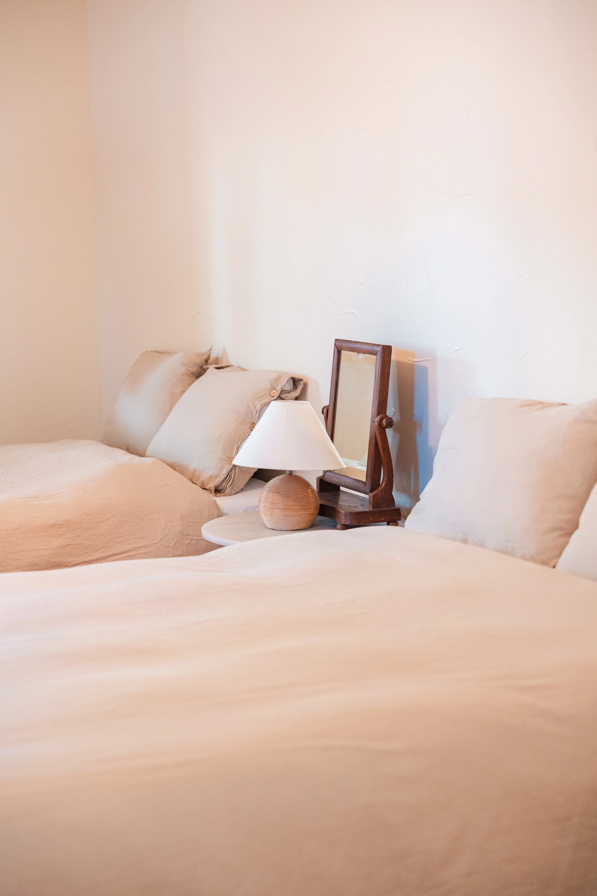 Two natural double mattresses, and linen sheets, cozy and quiet. Shares a bathroom with The Arie suite.