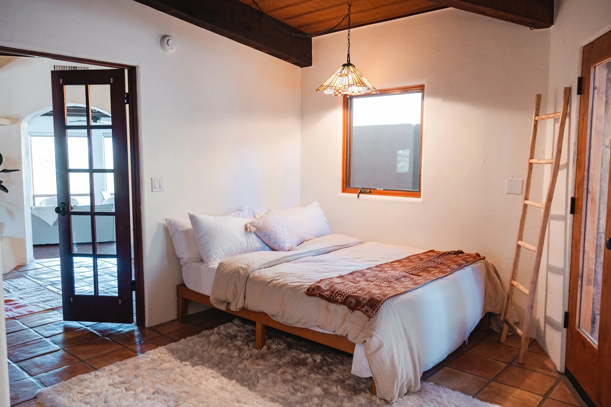 A natural queen mattress with linen sheets a private bathroom and french doors leading outside and to the main house.